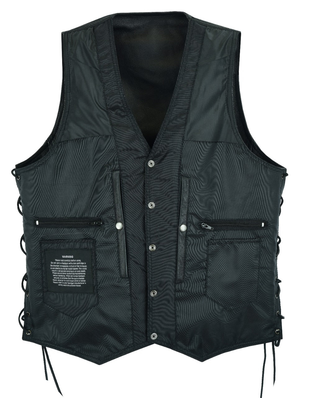 If you like the look and feel of premium leather and like to carry protection on your trips then you're going to want Dream Apparel's plain vest with side laces. This terrific vest features huge concealed gun pockets on both sides. You get an additional two inside pockets with zippered closures and two inside stash pockets. On the front you have another two stash pockets and two roomy waist pockets with zippered closures. You'll
