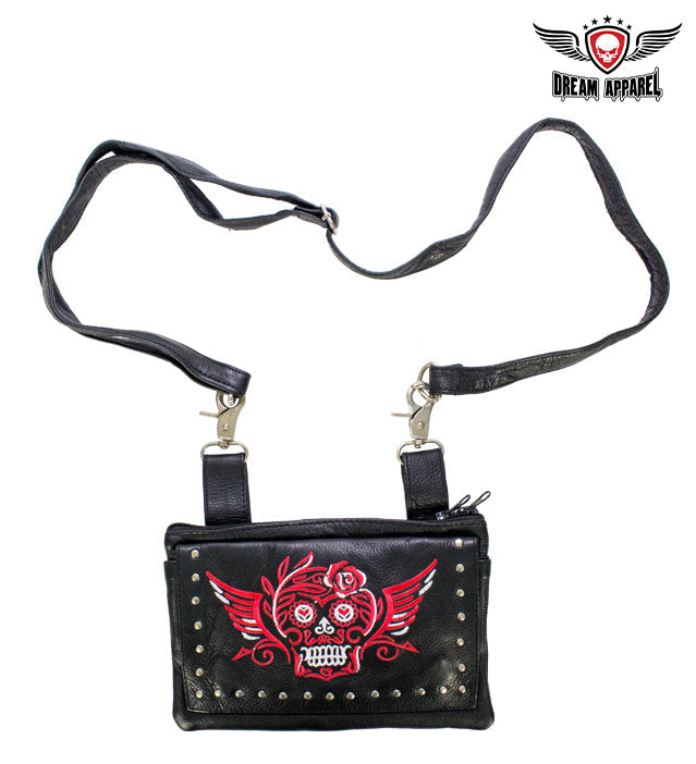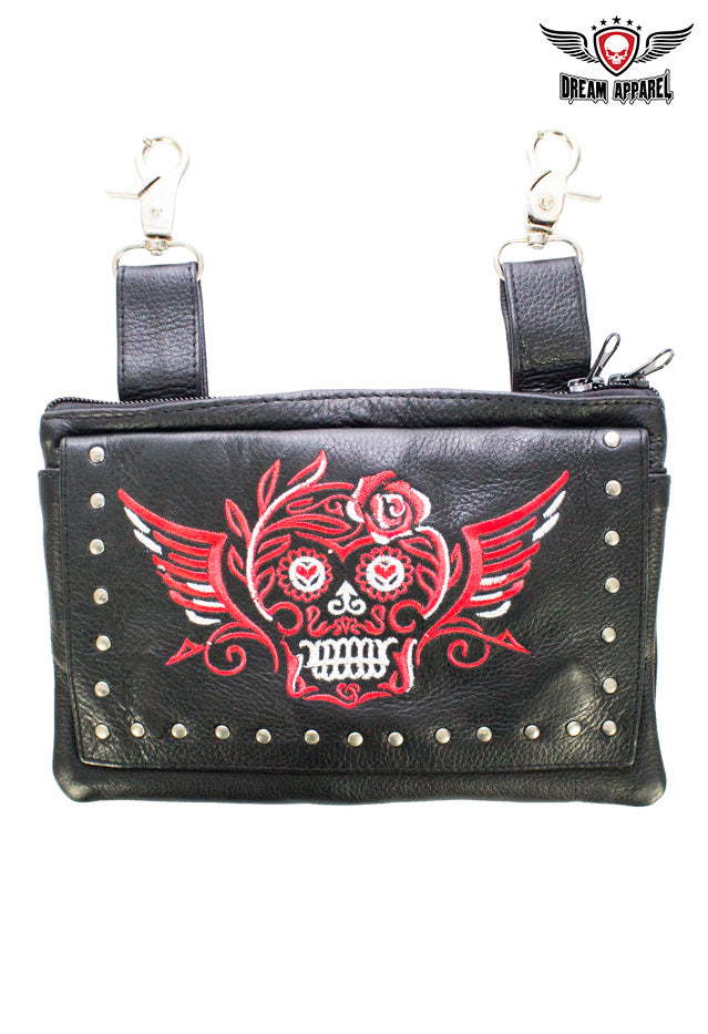 Studded Red & White Sugar Skull Naked Cowhide Leather Belt Bag