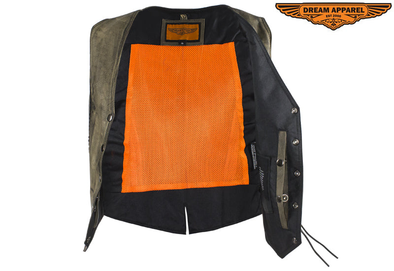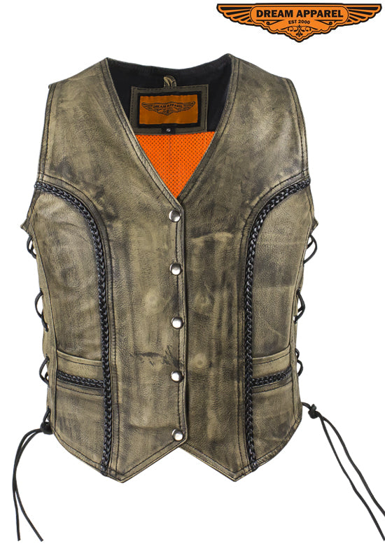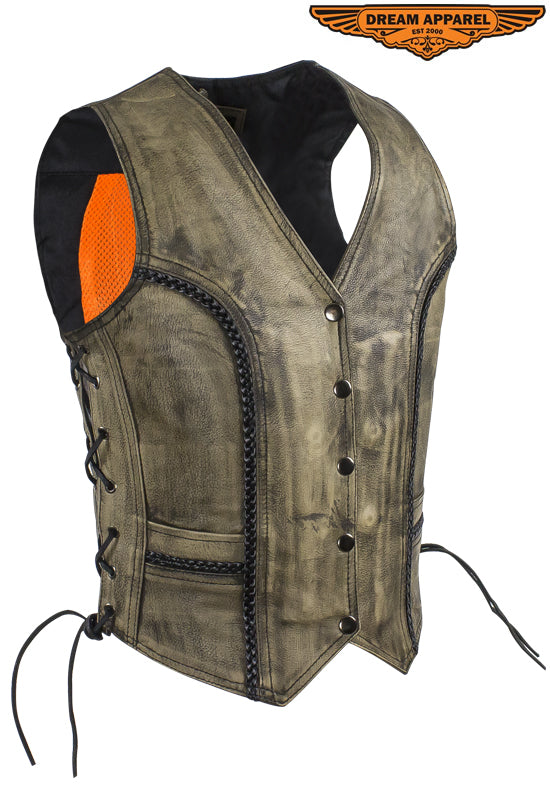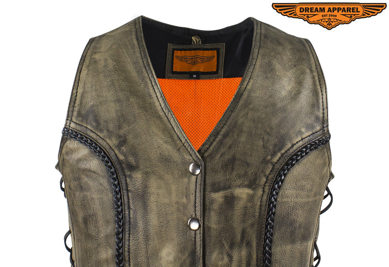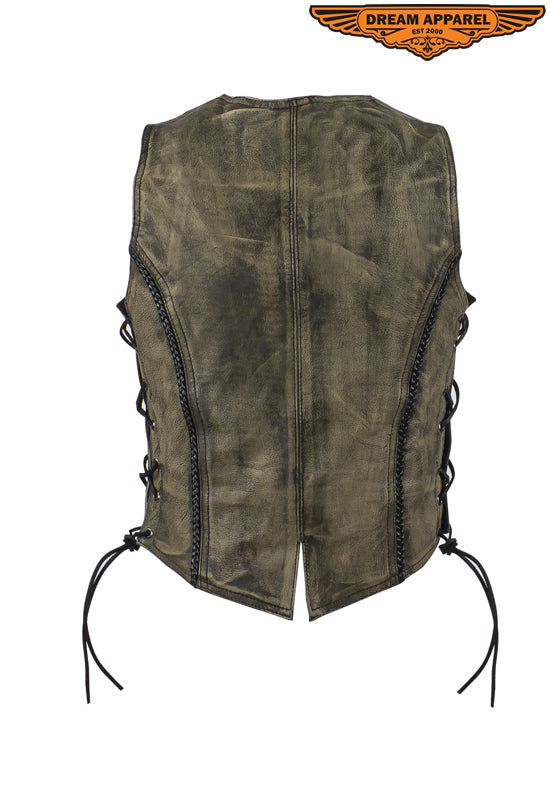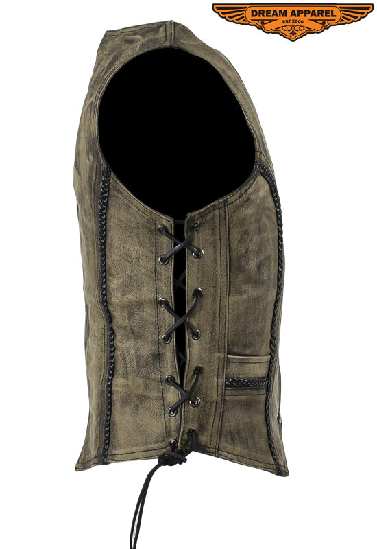 Women's Distressed Brown Leather Motorcycle Vest With Side Laces