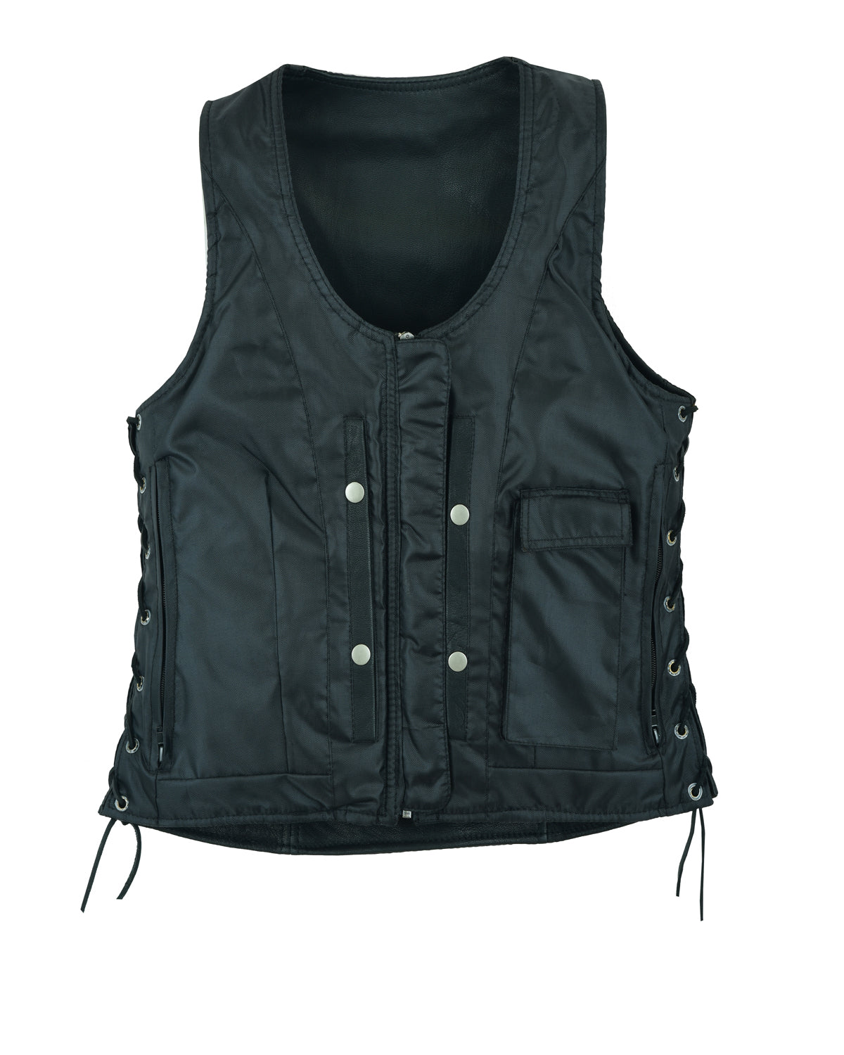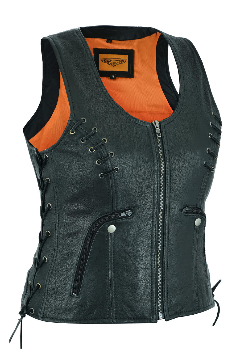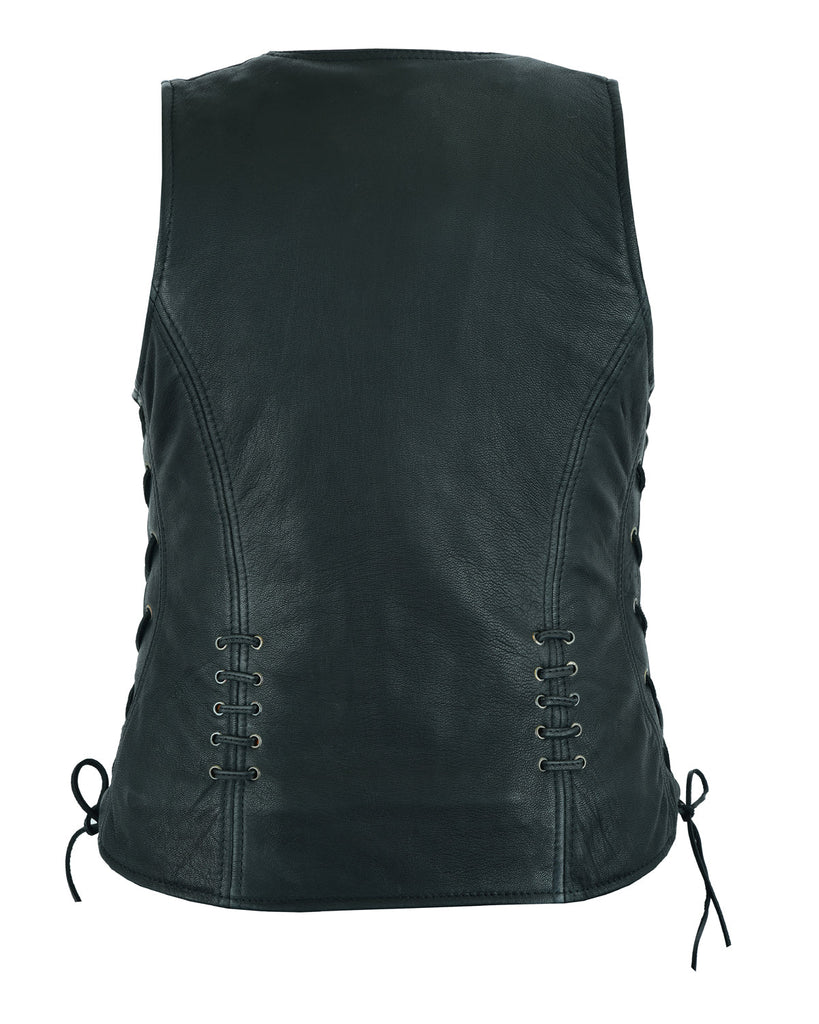 Dream Apparel's premium naked goat skin vest is the go-to ladies’ biker vest! Not only is this vest fashionable but it is very versatile. This premium naked goat skin vest has 5 pockets. The first two pockets are on the outside front which has credit card holders on the inside and a mesh pocket perfect for a lipstick! There are three inside pockets, the first two are 2 deep concealed gun pockets which can be used for your concealed weapon, ammo or other necessities. The other inside pocket is a slip pocket which can hold your cellphone. The leather quality is super soft, side laces for adjustable fitment!